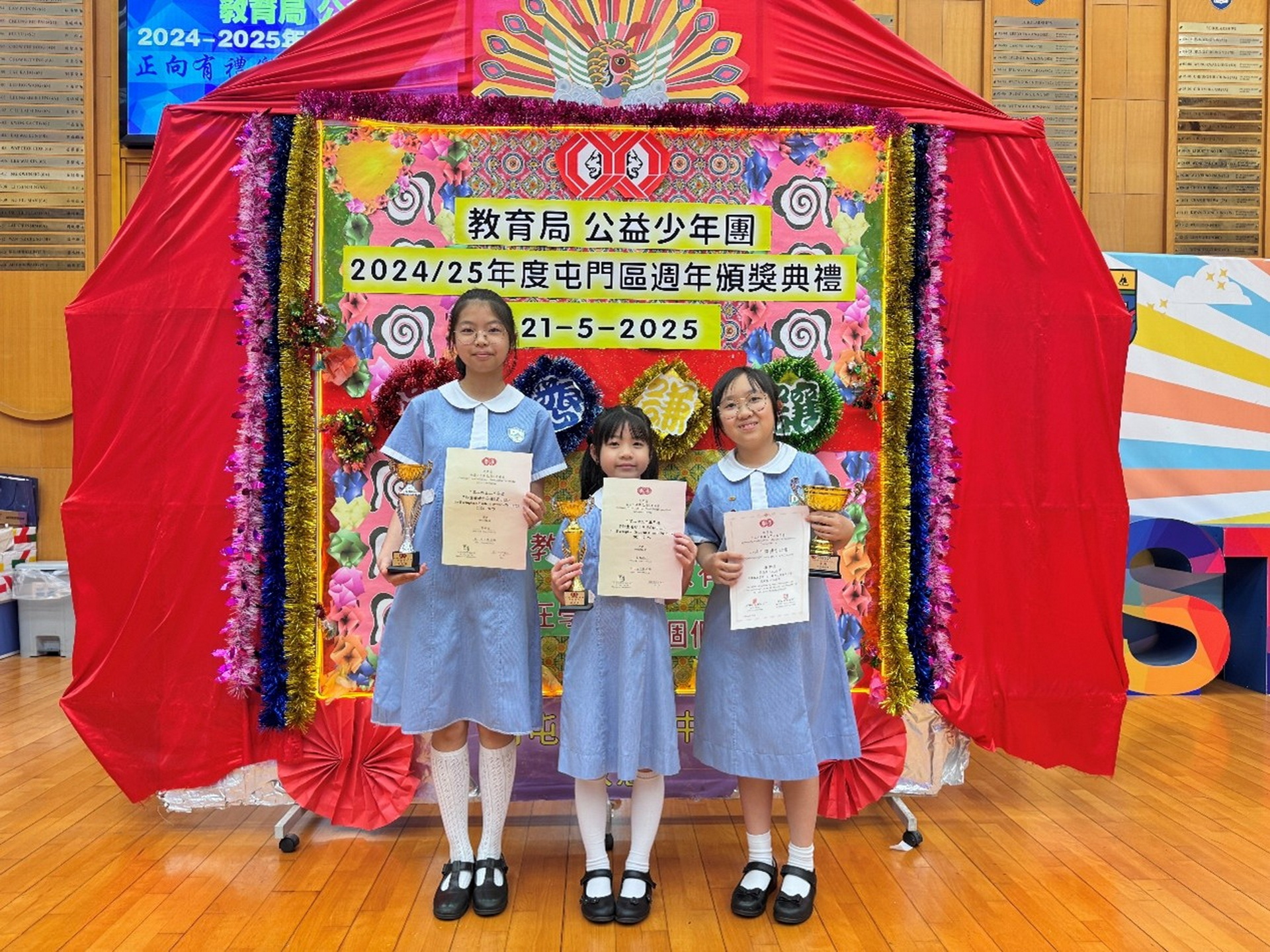 本校連續兩年榮獲屯門區公益少年團慈善花卉義賣金獎,亦會帶領尊師重道好少年及團員獎勵計劃得獎者前往周年頒獎典禮領獎。