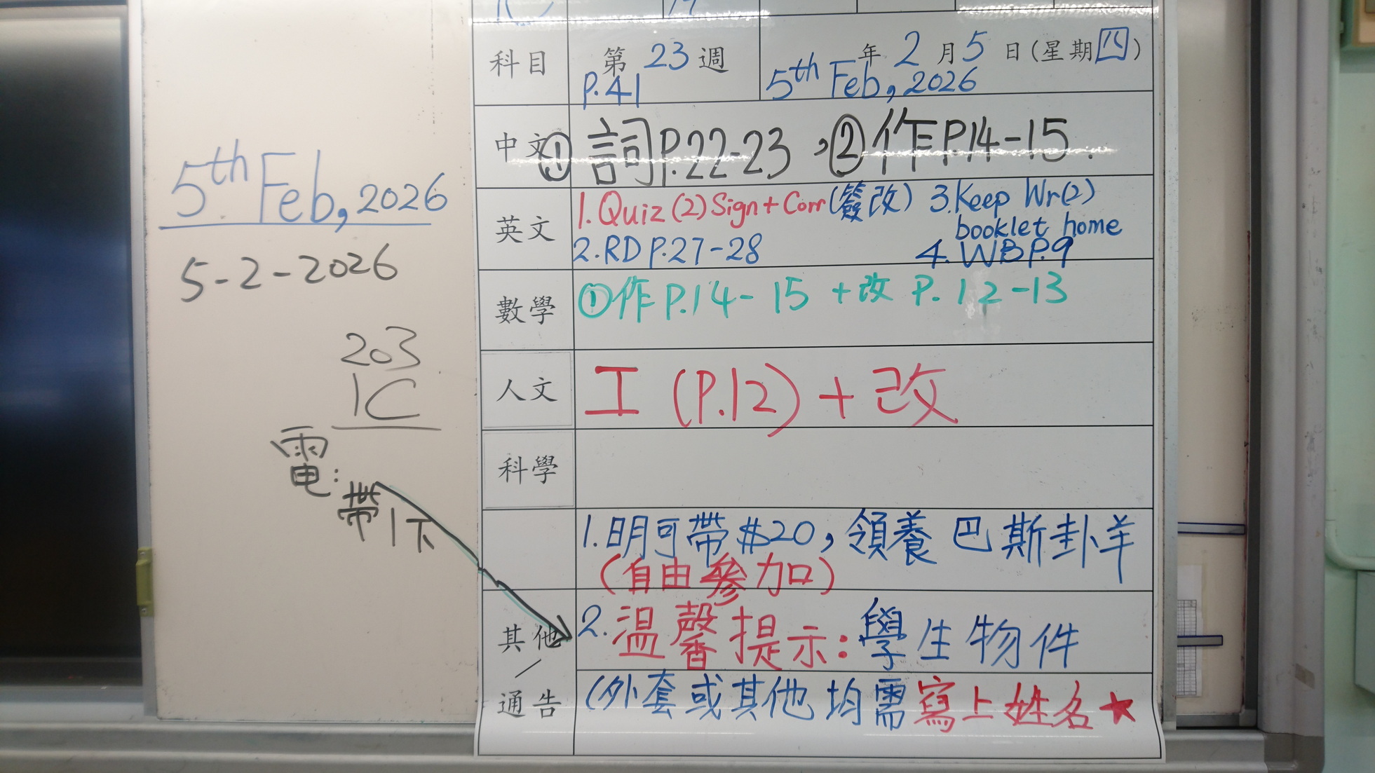 二至三年級家課代號表