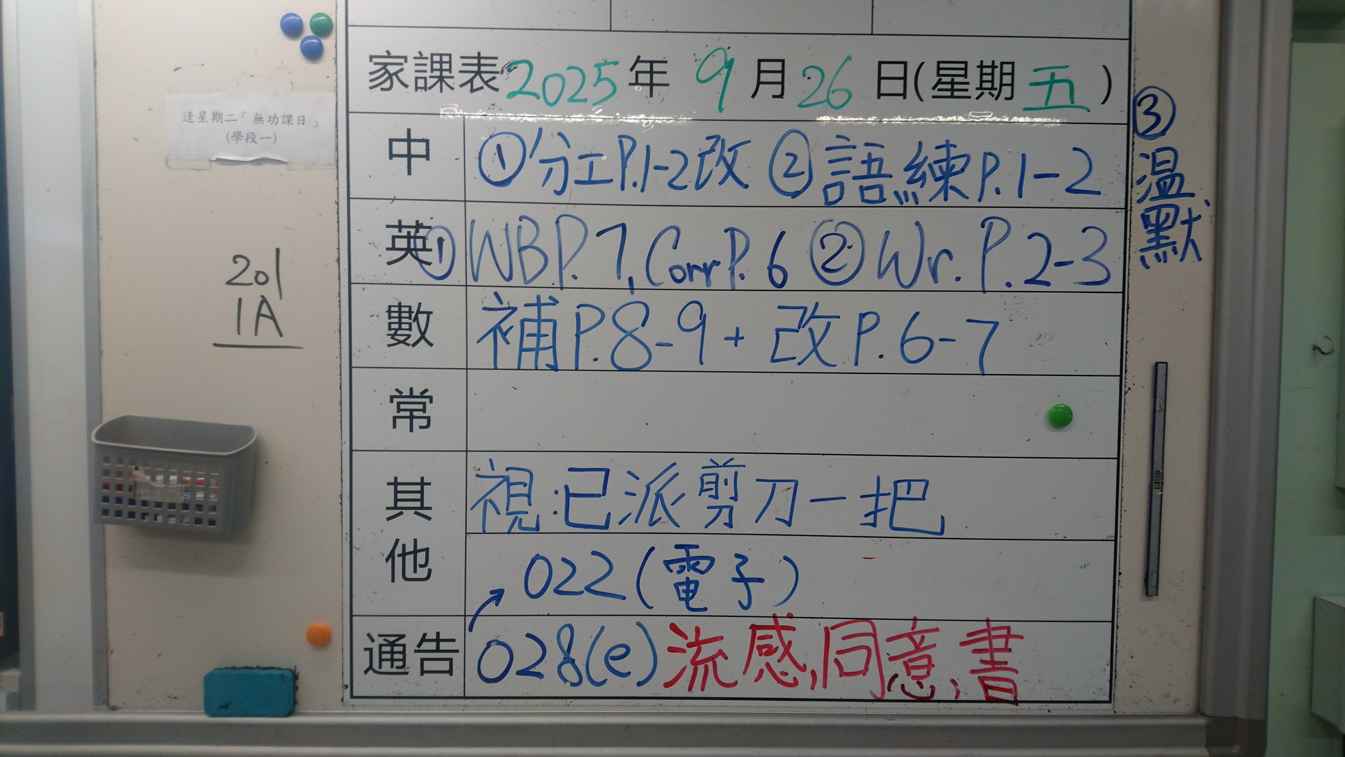 一年級家課代號表