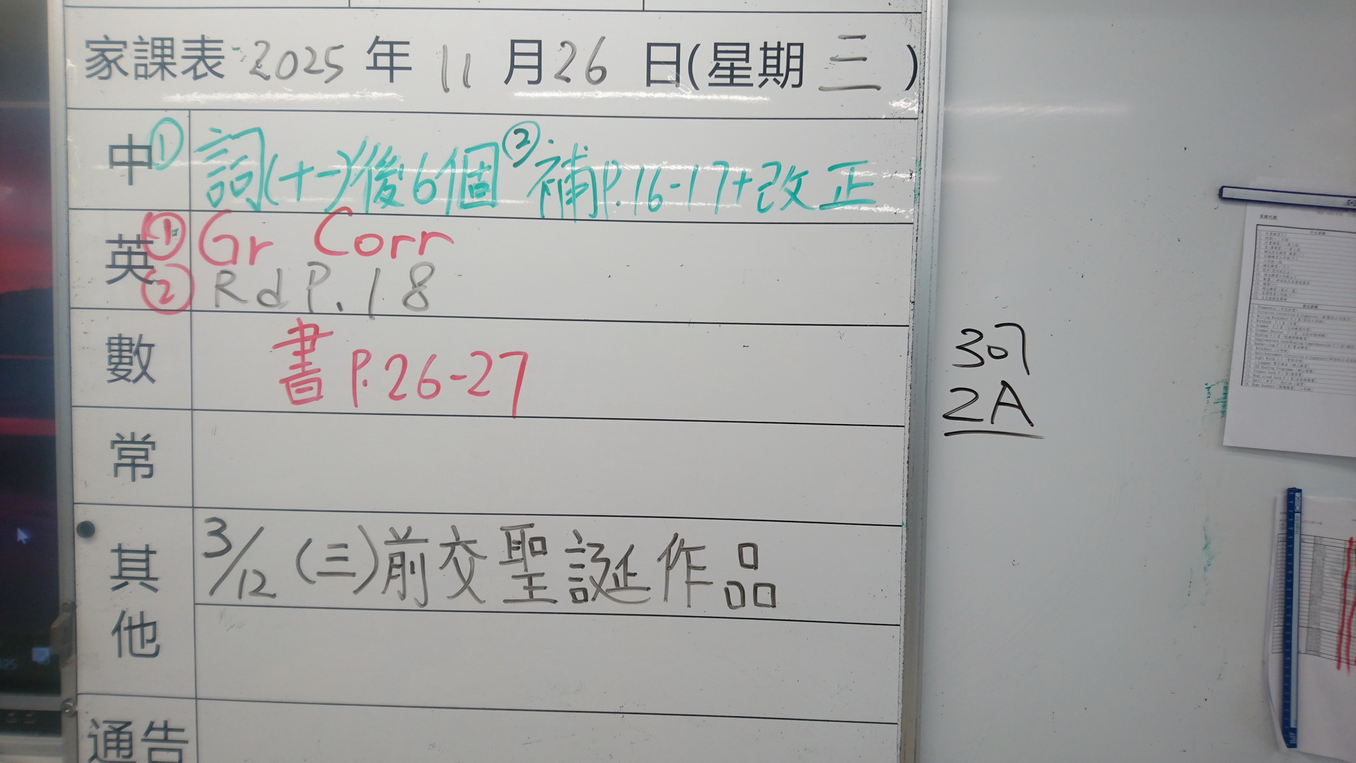 二至三年級家課代號表