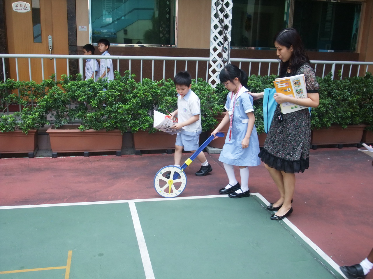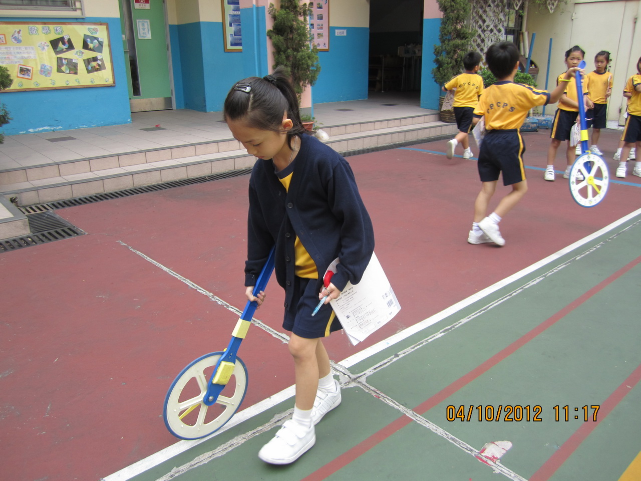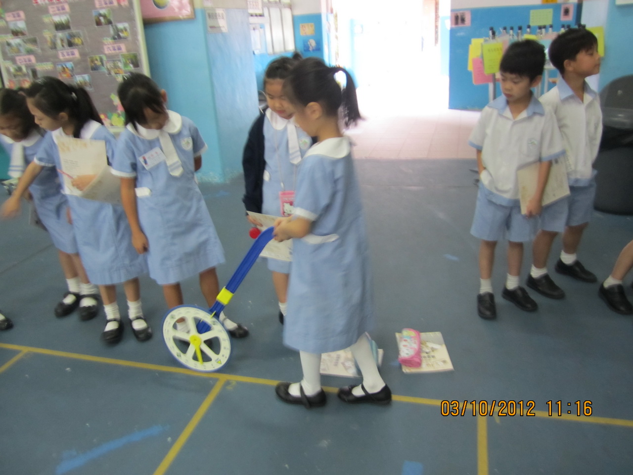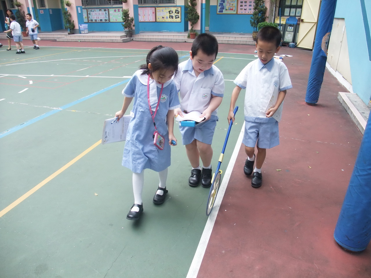 二年級的同學利用滾輪量度籃球場的長度,從活動中學習,同學們都非常投入。