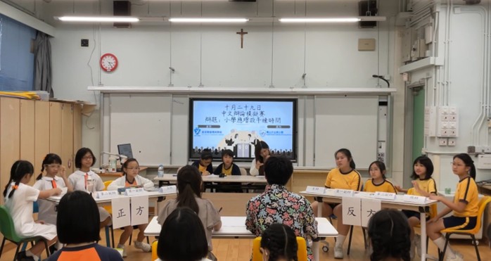 中文辯論校隊會挑選優秀的選手,其中包括六年級及五年級辯員,均能代表學校參加全港性校外比賽,如「文化盃」及「啟辯盃」,與全港小學一較高下。其中,本校選手在「24-25年度啟辯盃」小組賽中勝出,6B袁芷琳更獲最佳辯論員。