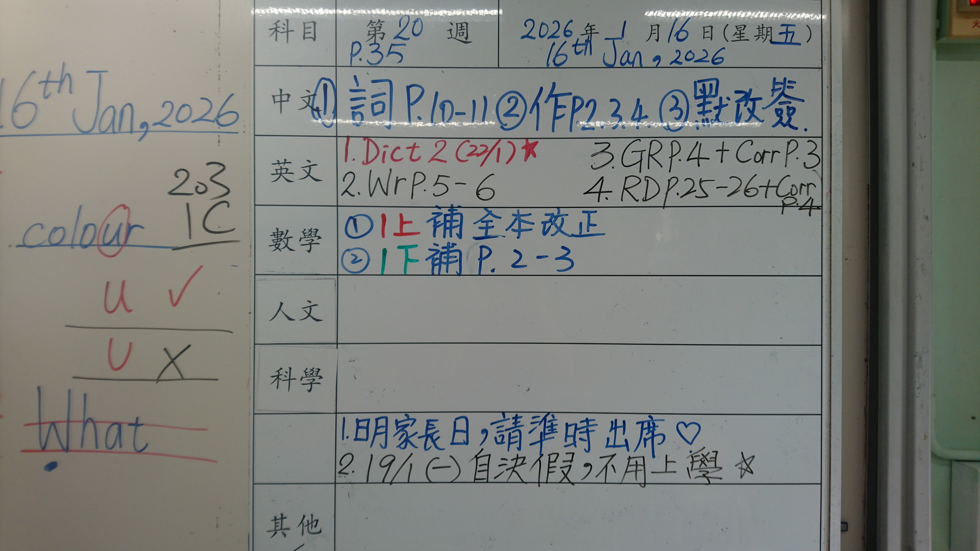 一年級家課代號表