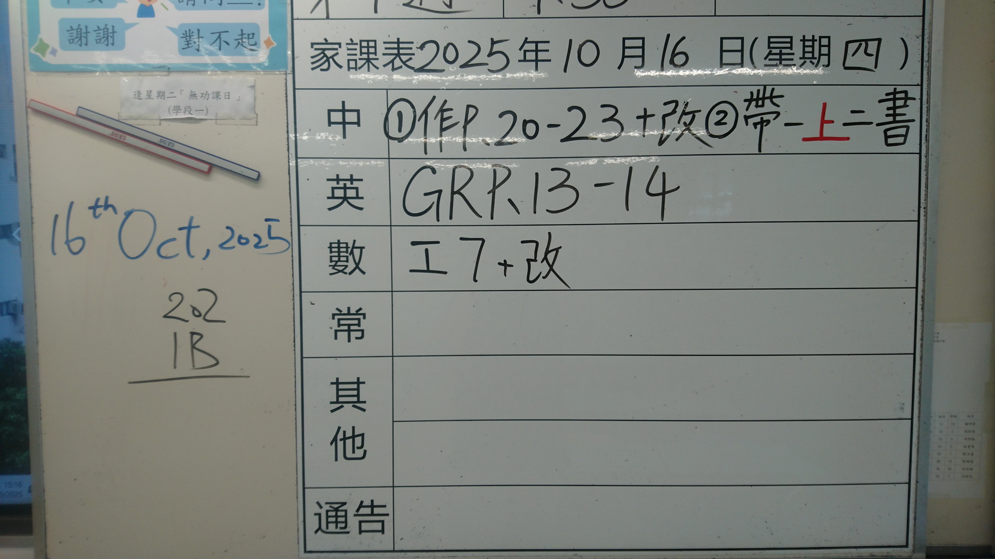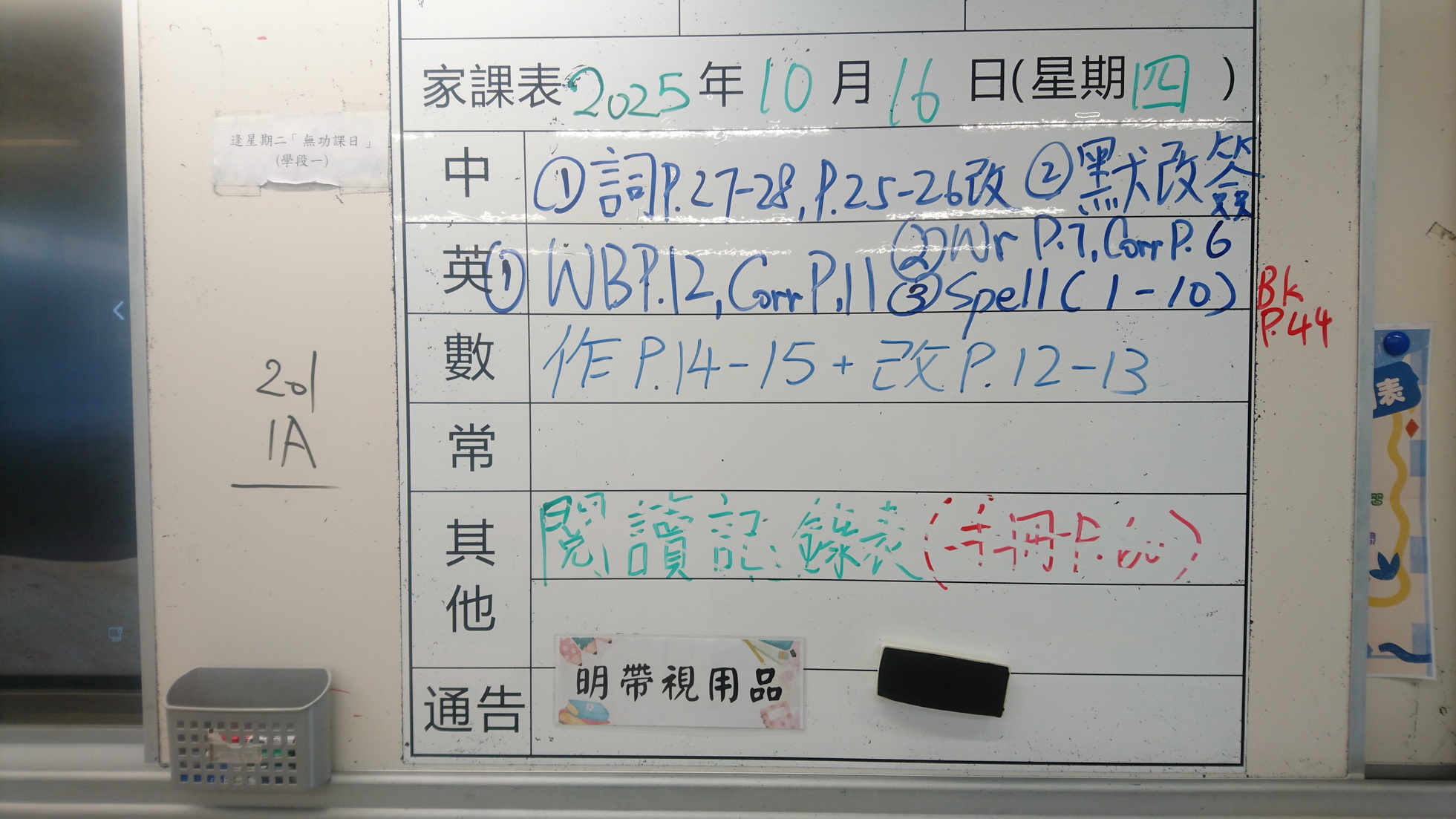 一年級家課代號表